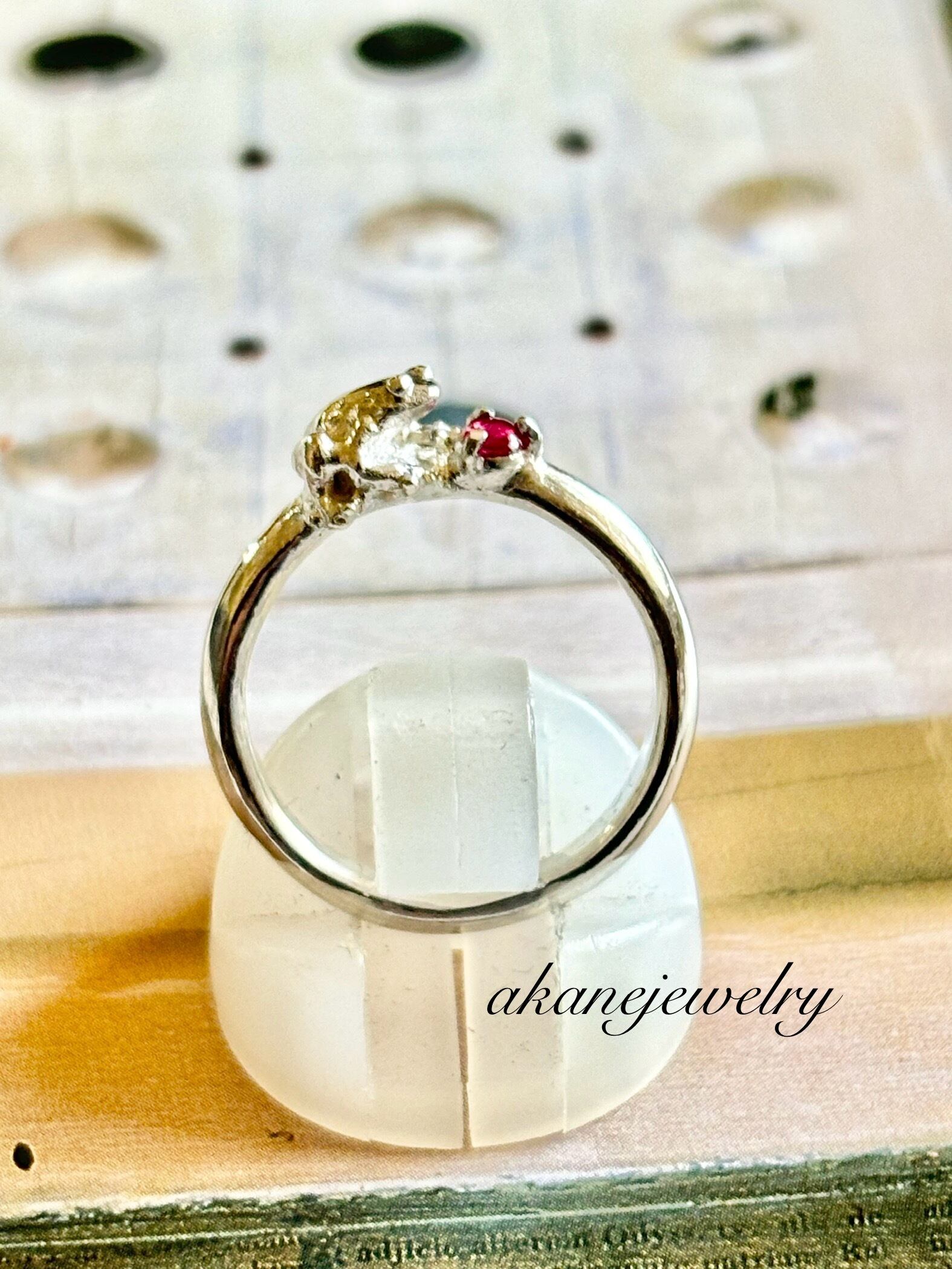 小さな小さなカエルの指輪を作りました。宝物のルビーを持ってます。